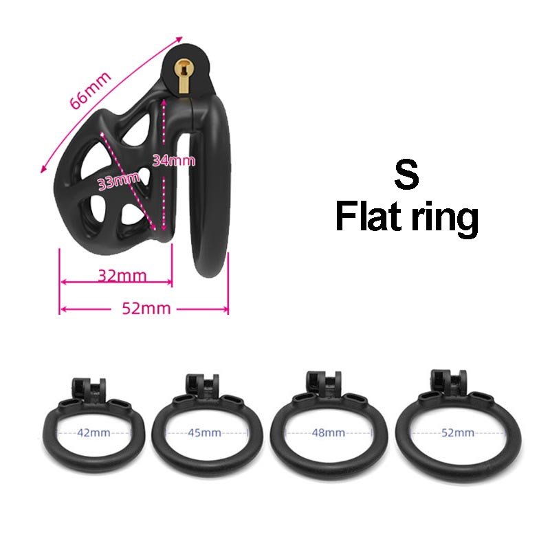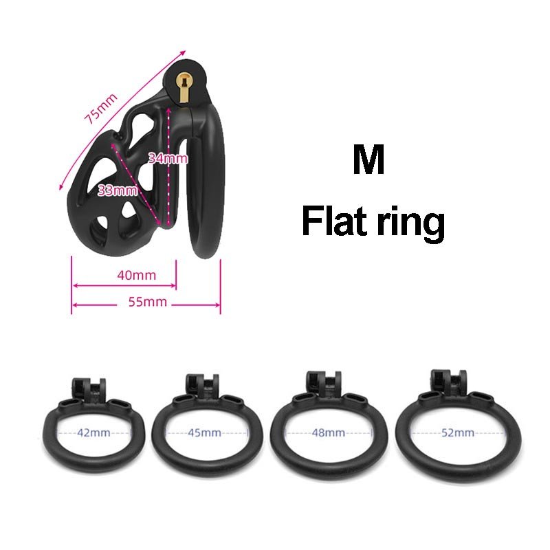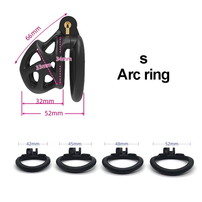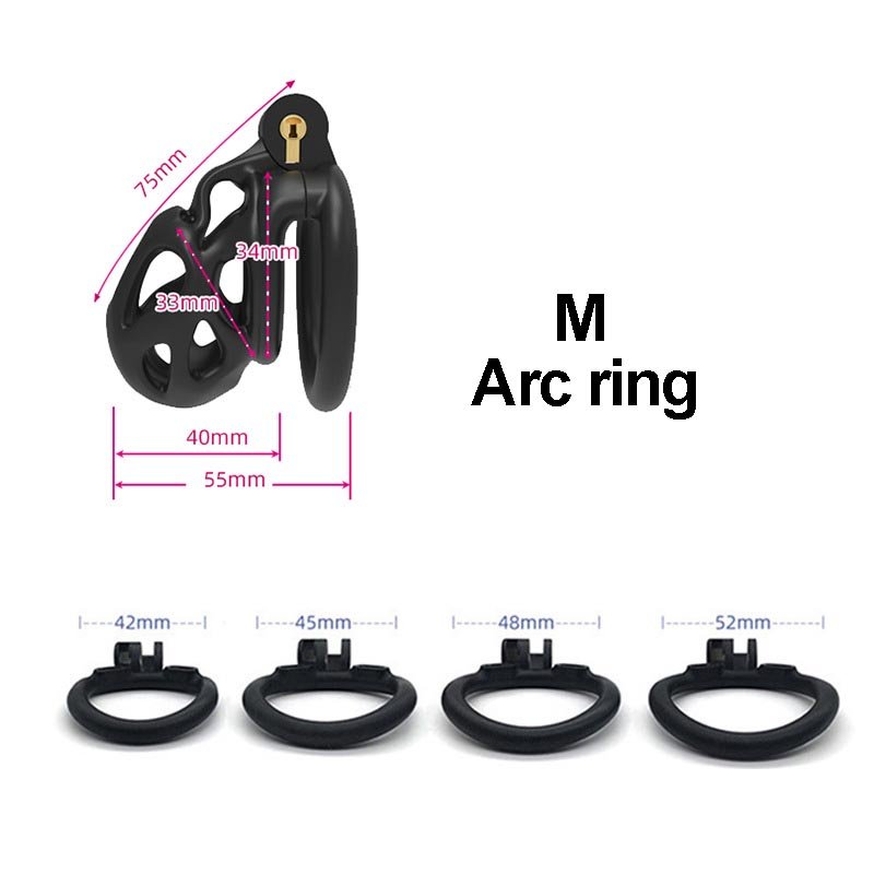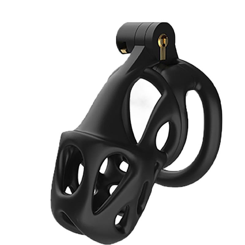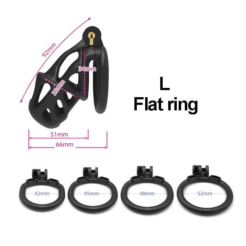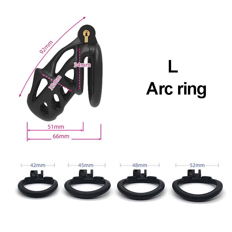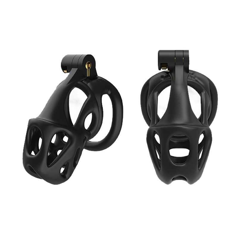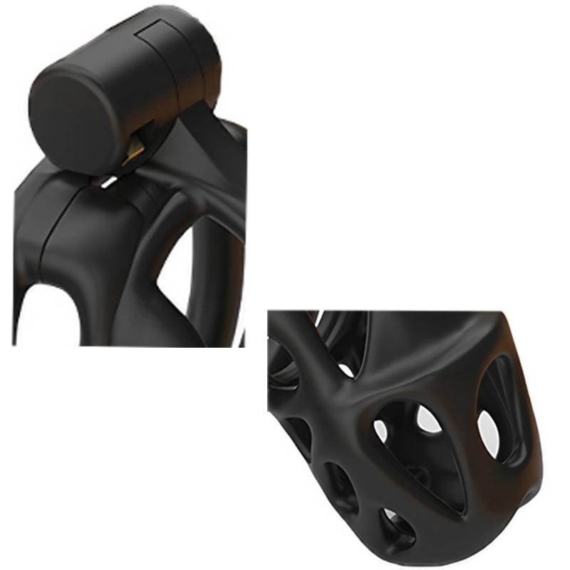 This black chastity cage features a streamlined, hollowed-out design that ensures both breathability and a lightweight, comfortable wearing experience. It offers two different types of locking rings—curved and flat—allowing users to choose freely based on their personal needs for the best fit and comfort. Additionally, the cage is available in three different sizes, catering to various dimensions while ensuring both security and comfort. Its unique hinged locking mechanism not only enhances convenience but also improves overall security, making it an ideal choic