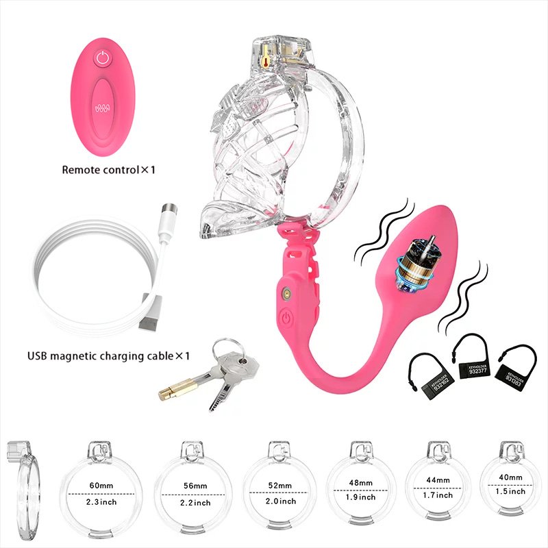 This resin chastity cage features a sleek, open-frame design that balances security and comfort. It is available in 19-2Z, with a 35mm (1.38 inches) inner diameter and 84.6mm (3.33 inches) total length. The cage is designed to provide a snug yet breathable fit, ensuring long-term wearability without compromising security. The integrated locking mechanism reduces external bulk, making it more discreet and comfortable under clothing. Available in pink, black, green, and transparent, this cage offers a variety of color choices to suit different preferences. Additionally, a vibrating anal plug can be selected as an optional accessory, available in black and pink for a customizable and enhanced experience.