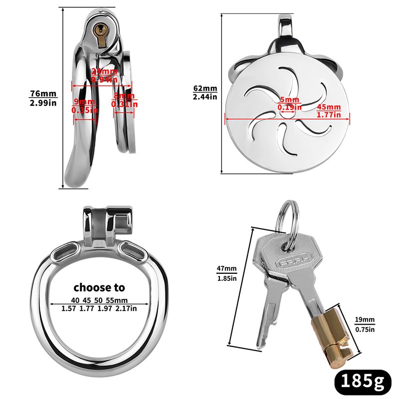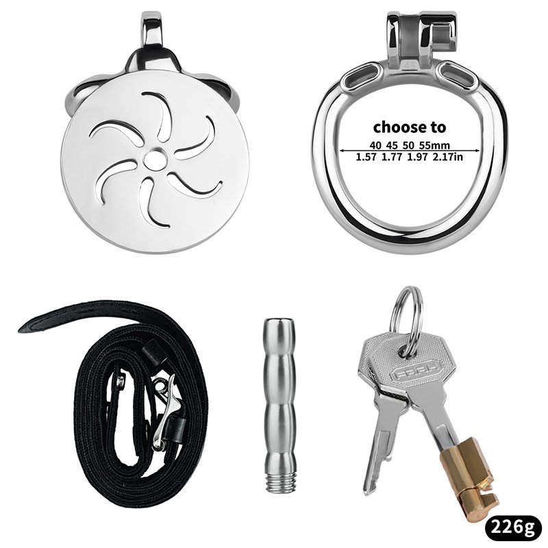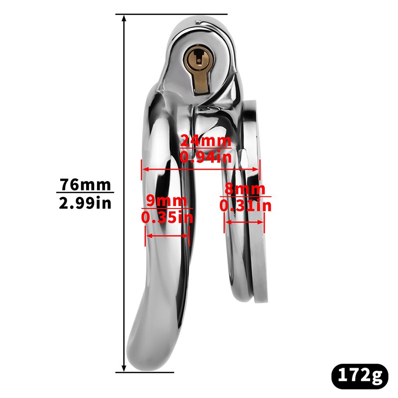 This elegant and compact design embraces a minimalist aesthetic, featuring delicate hollow patterns that enhance breathability while adding a refined visual touch. The polished metal surface feels smooth and comfortable against the skin, ensuring long-term wear without irritation. Multiple ring sizes are available for a perfect fit, and it can be paired with a metal catheter and locking belt for enhanced restraint. Easy to assemble and secure, the curved ring sits naturally against the body, combining comfort and sensual appeal—perfect for those who appreciate subtle sophistication.