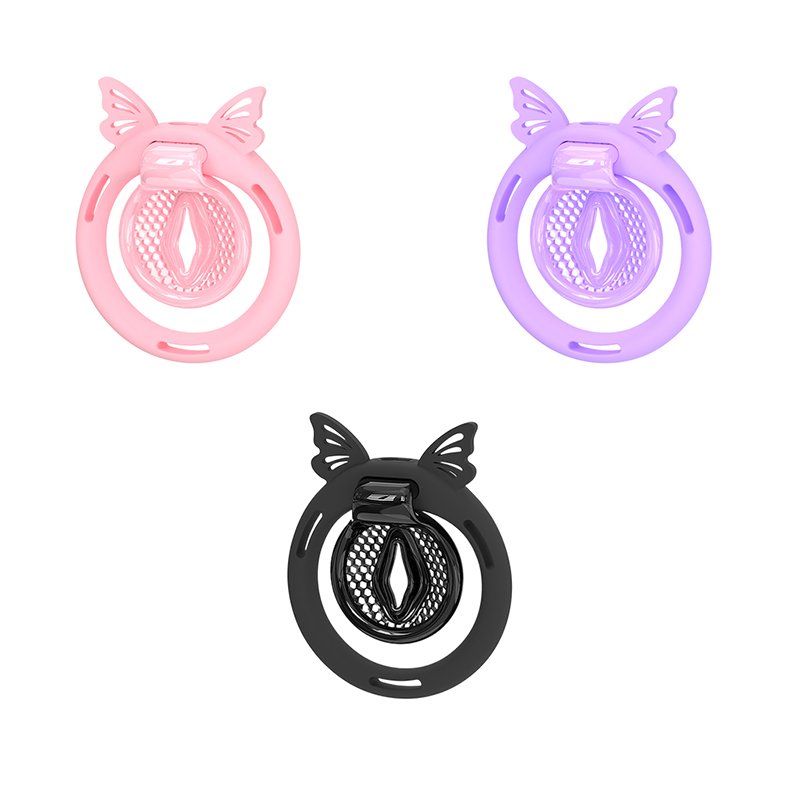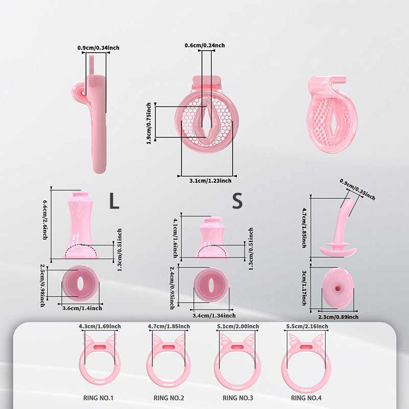 • Dimensions: Cage inner diameter 3.1 cm; S-size inverted plug: length 4.1 cm, width 3.4 cm, inner diameter 2.4 cm; L-size inverted plug: length 6.6 cm, width 3.6 cm, inner diameter 2.5 cm; 6 sizes of securing rings: 4.3/4.6/4.9/5.2/5.5/5.8 cm; 4 sizes of butterfly rings: 4.3/4.7/5.1/5.5 cm