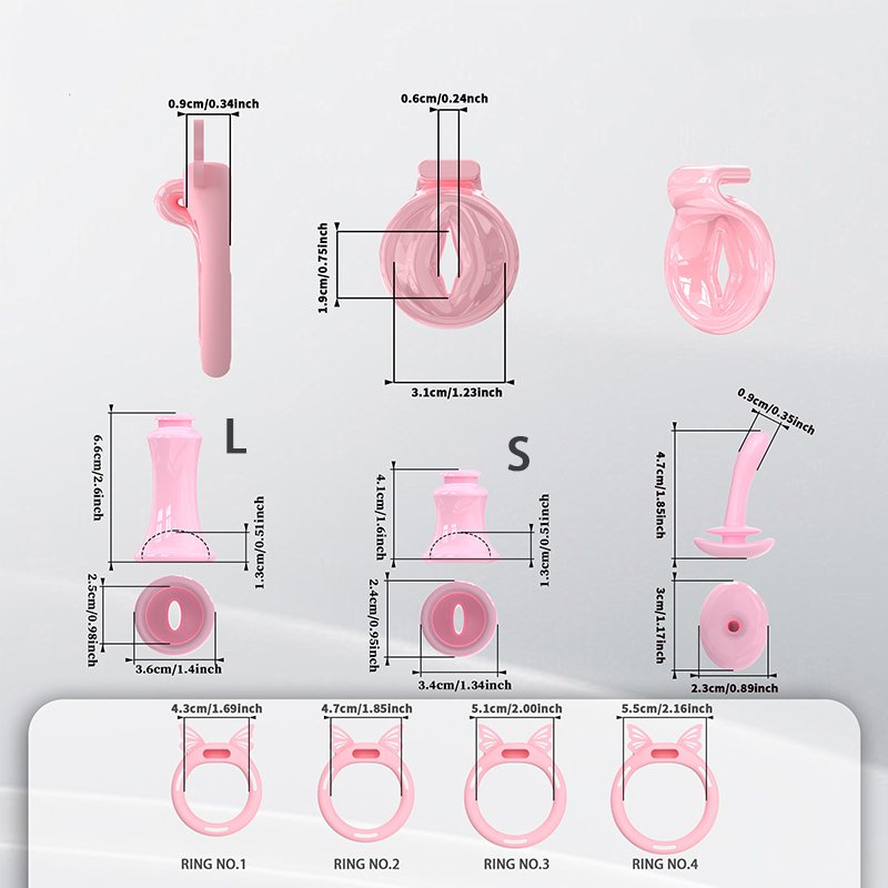 • Dimensions: Cage inner diameter 3.1 cm; S-size inverted plug: length 4.1 cm, width 3.4 cm, inner diameter 2.4 cm; L-size inverted plug: length 6.6 cm, width 3.6 cm, inner diameter 2.5 cm; 6 sizes of securing rings: 4.3/4.6/4.9/5.2/5.5/5.8 cm; 4 sizes of butterfly rings: 4.3/4.7/5.1/5.5 cm